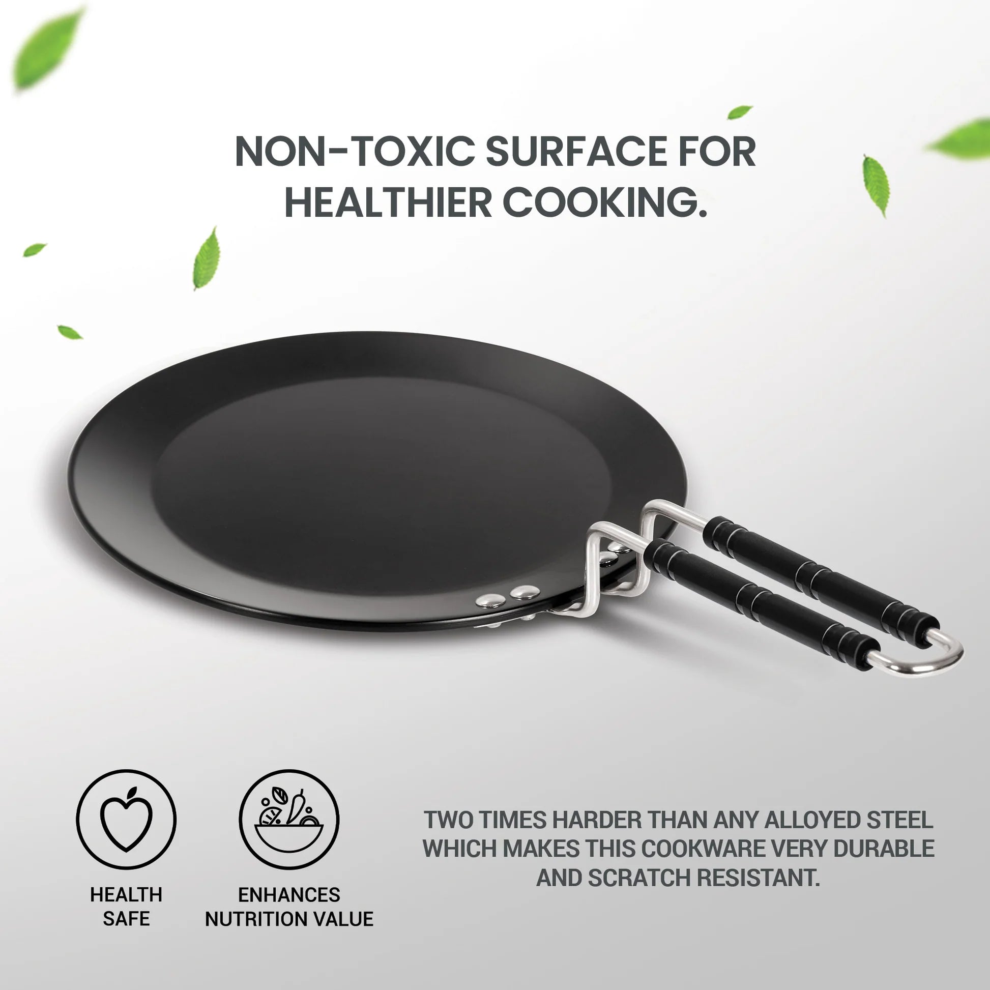 - Non-toxic surface for healthier cooking. Easy to clean and maintain. It has Stainless steel wired handles for long lasting usage.