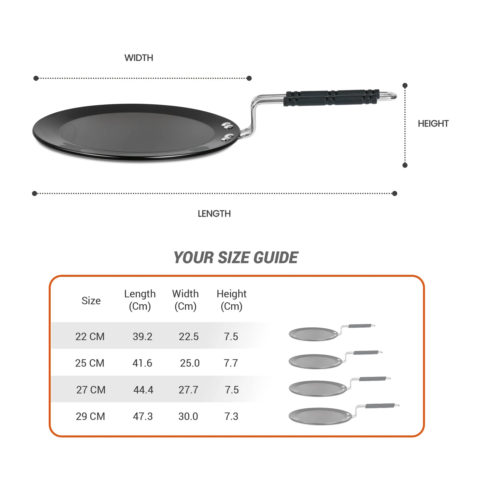 Introducing Hard Anodized Tawa. It is two times harder than any alloyed steel which makes this cookware very durable and scratch resistant. Hard anodized aluminium is great as a heat conductor. It spreads heat evenly and perfectly. It is stable to use with spoon and spatula for your cooking convenience. It has Stainless steel wired handles for long lasting usage. It is ideal for making Rotis, Phulkas, Chapattis, Parathas, crepe, tortillas. These Tawa are easy to clean and compatible with Flame, Gas Stove.