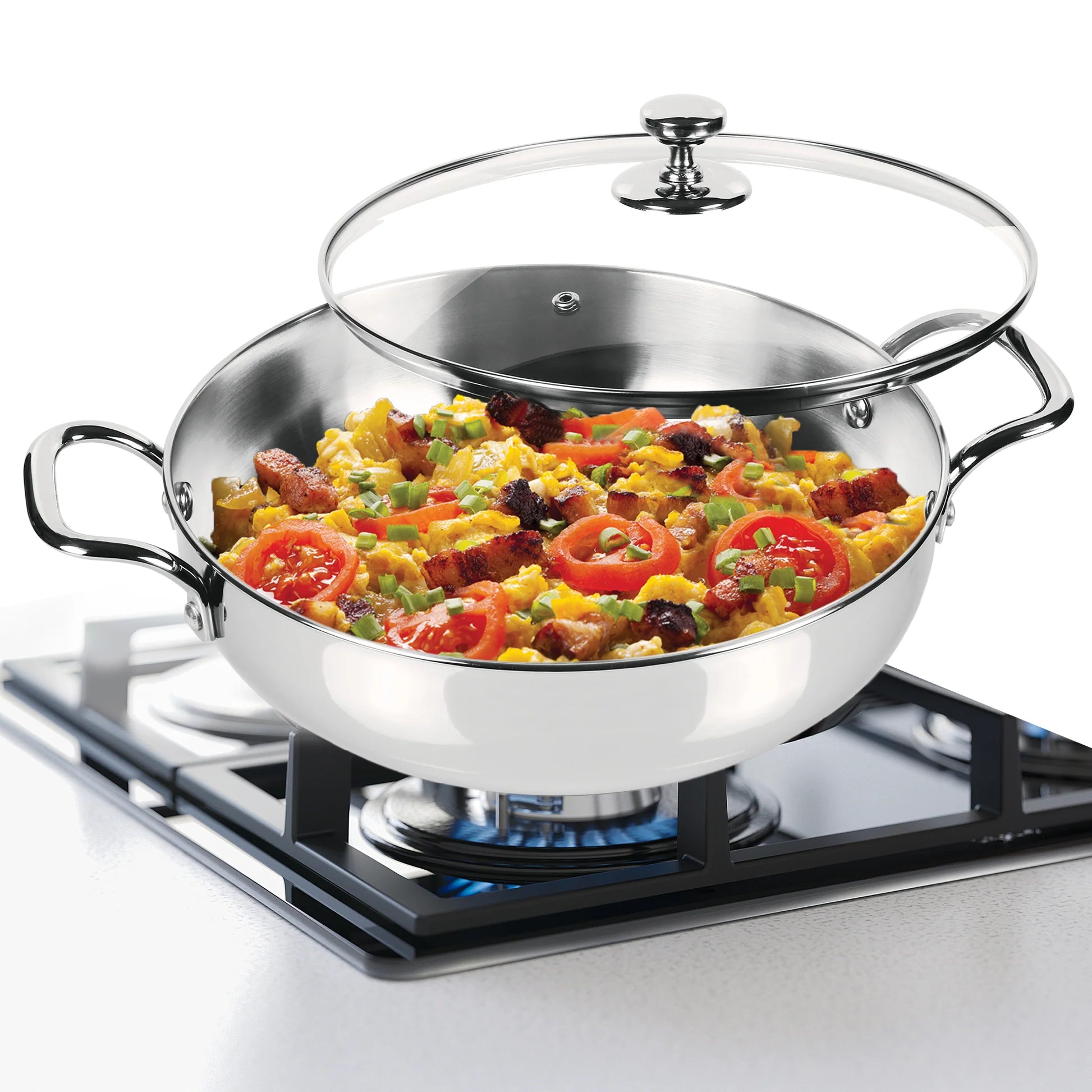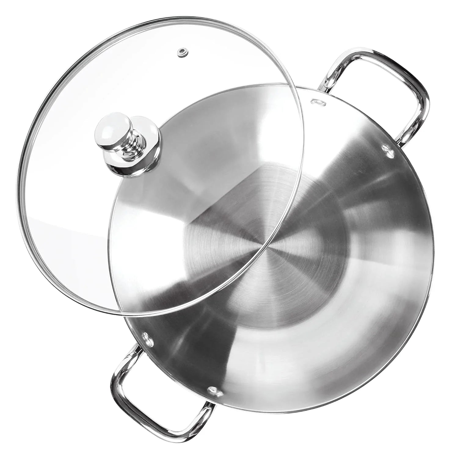 * Suitable for making a variety of dishes, with a superior hygienic stainless steel finish and convenient features like a rolled edge for dripless pouring and a toughened glass lid with air vent.