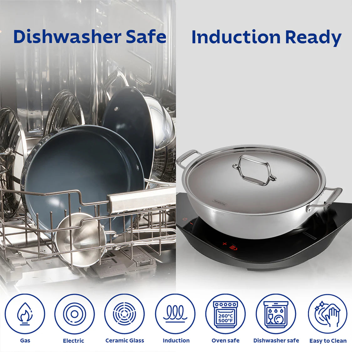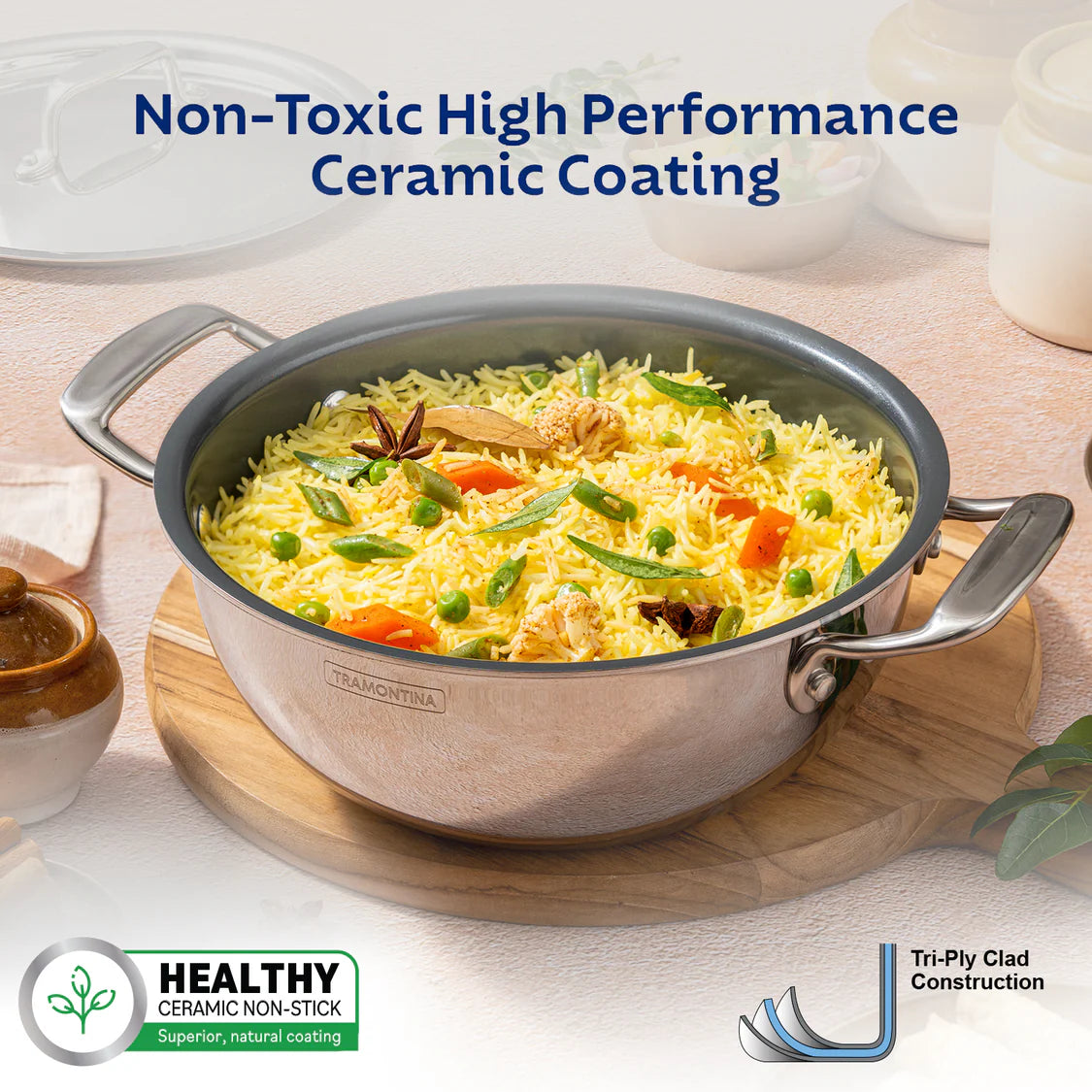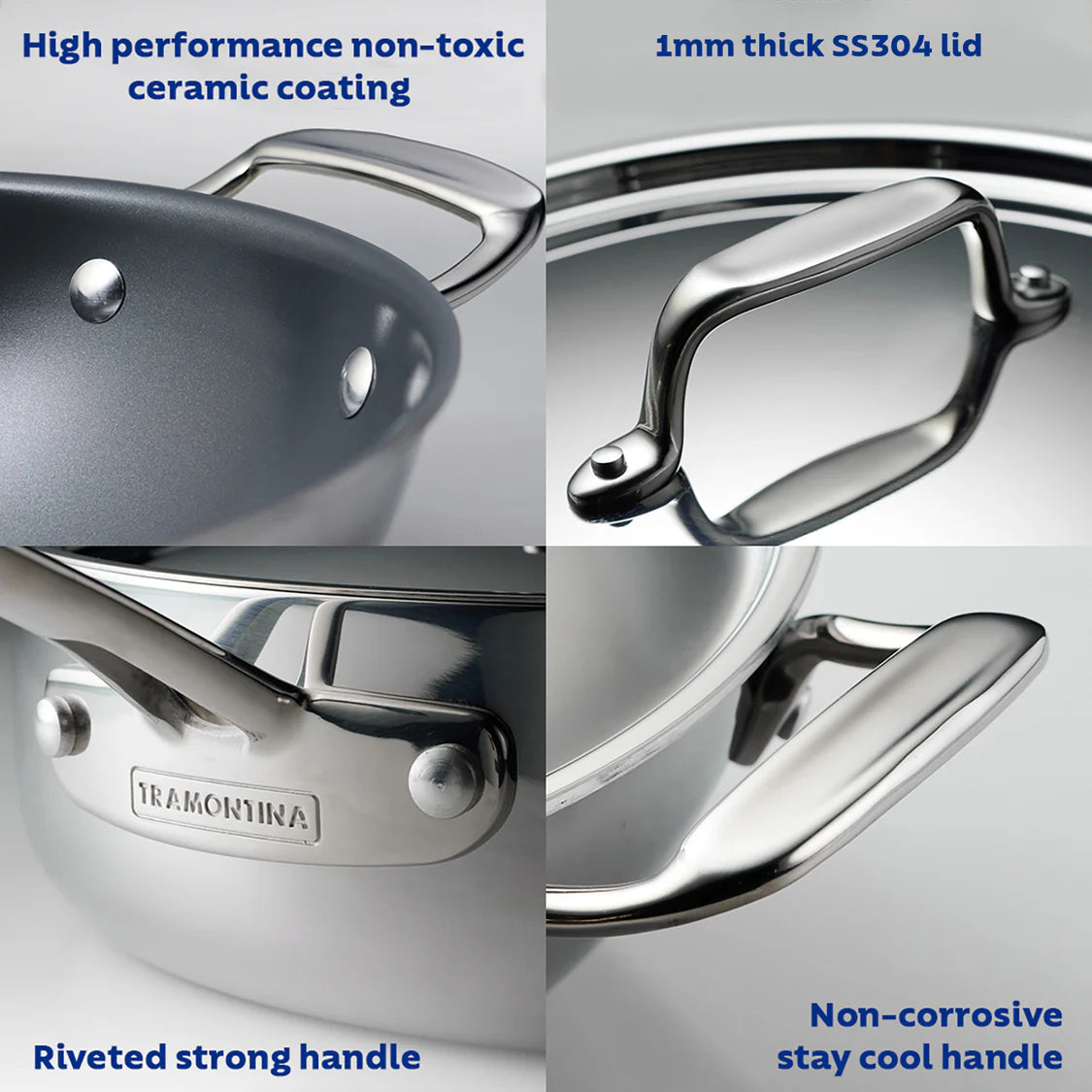 Tramontina Fusao Deep Kadai with SS Lid (20, 24, 26, 28, 32, 36, 40cm) Tri-Ply Clad Stainless Steel Ceramic Coated